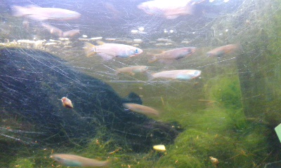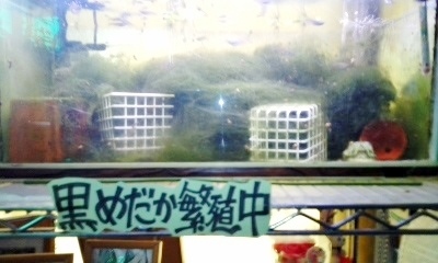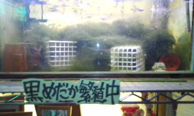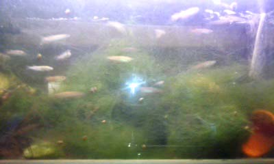 ウィローモスの水草だけでなく無駄な藻が繁殖。魚にとっては良いのだろうけど、鑑賞も兼ねる小さな水槽にはよくない。それと何を間違えたか廃棄する靴下が卵をつけるのによいと聞いたことがあり、黒色のものを吹き流し状にして入れておいたため、染料が溶け出して水そのものが黒くなったと判明した。助かったのは今時でも染料はメダカにとって有害ではないのかということだ。各個体は元気にえさをほしがっている。時間のある時に無駄な繁茂した藻の整理と、水取り替えを考えている。