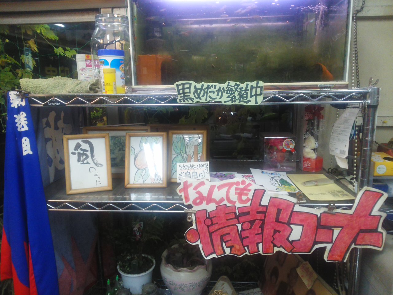 親子共生したことによって、水藻の中が期待でわくわくです。表に出てこない分だけ神秘的です。親が自分の卵から稚魚を食べるなんて、許せないね。今どきの若い人間の母親じゃあるまいしね!だめよ~ダメダメの世界です。片方の写真は棚に乗せた水槽の雰囲気です。