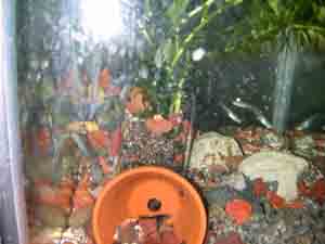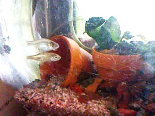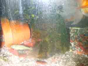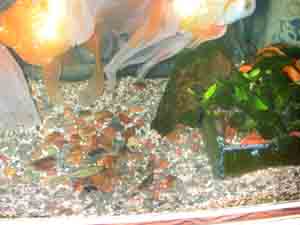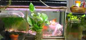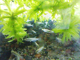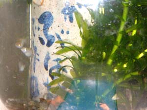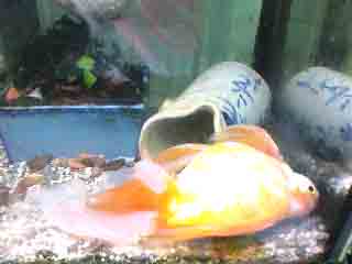 竜金の中に「くちぼそ」を1匹入れておいた。最初は大きな金魚3匹の中に1匹で驚いていたようだったので、もう1匹買ってきて入れた。これも買ってくることしか今はできないのが残念(時間的にも、環境的にも)。すると今は金魚の30分の1くらいの大きさなのに、元気がいい、尾びれの下などに入ったりしては、あげるえさなど横取りするようになった。2匹になったからだろう。もともと「くちぼそ」は、めだかを仕入れたときに混ざっていたものでした。めだかと一緒だとすぐ卵を食べてしまうといわれて、金魚の中に入れたのでした。とぼけた竜金の中で、直線的な動きのあのなつかしい「くちぼそ」がだんだん大きくなっていくのを見るのも楽しいものです。近々に画像を掲載しようと思います。