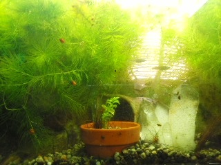 最新の水槽風景です。同居のために置いた流しの三角コーナーが見えますか?